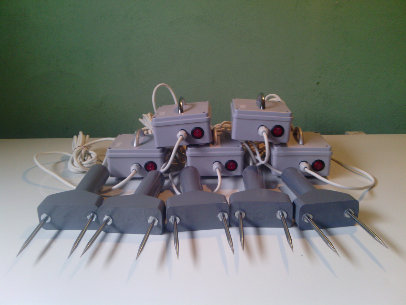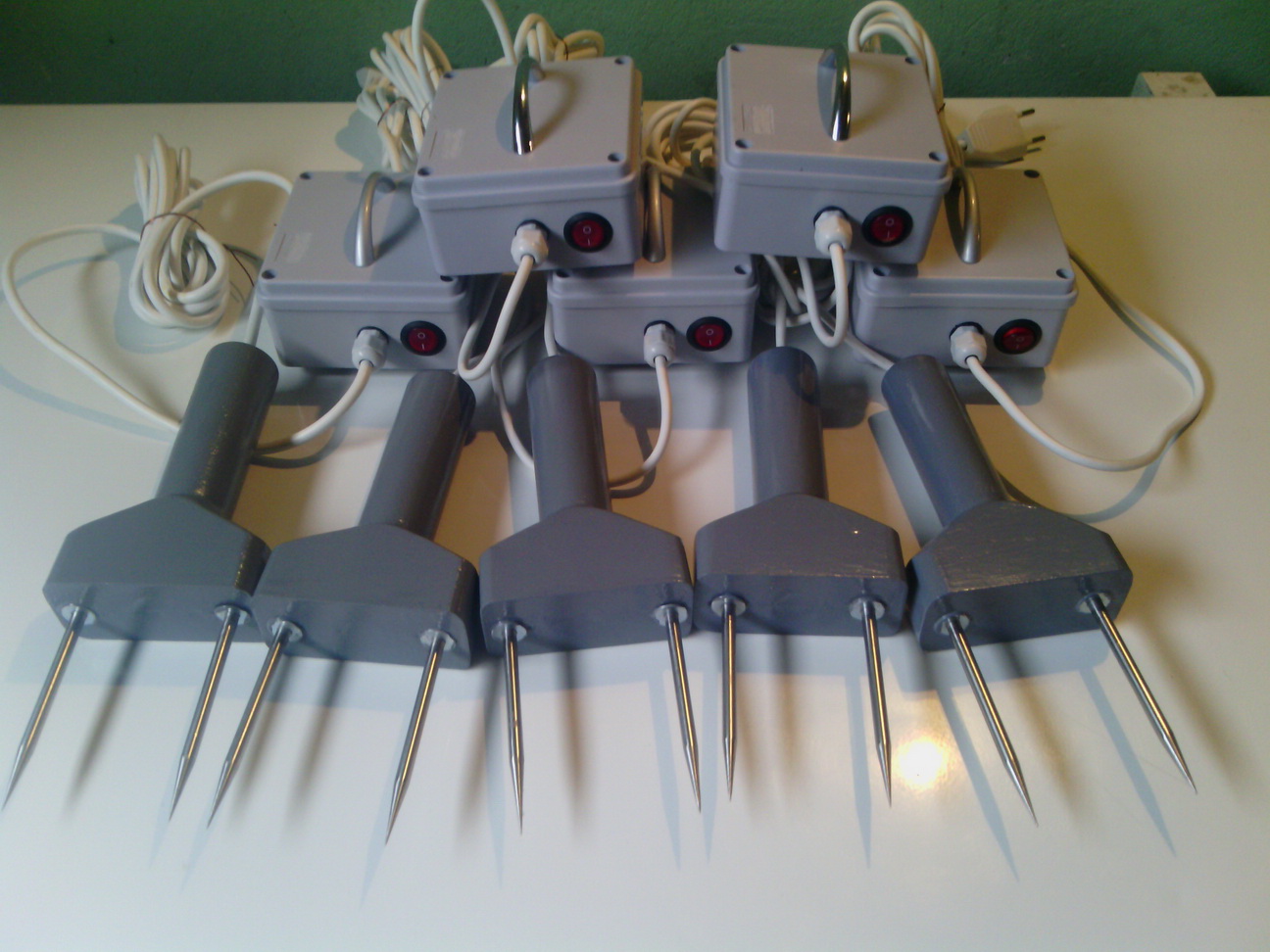 Ubodete viljušku u vrat na 5 - 10 cm iza ušiju. U tom momentu svinja se ukoči i pada. Viljušku ispuštate iz ruke, to jest ostavljate je celu u vratu! U vrlo malo slučajeva se dešava da svinja zauzme takav položaj da ne može da padne. U tom slučaju sami je oborite. Obratite pažnju da se ne omogući izvlačenje viljuške zapinjanjem o neki predmet prilikom pada. Sav ovaj posao radite golim rukama i svinju slobodno dirate po telu ne samo vi, nego i drugi ako pomažu pri klanju, bez ikakve bojazni da će vas struja prodrmati. Aparat nema ulogu da ubije ili da šokira svinju, već samo da je obori i drži u prilično mirnom stanju dok se obavi proces klanja. Neka vam malo trzanja zadnjih nogu ne smeta jer to pomaže da svinja dobro iskrvari. Kad ocenite da je svinja dovoljno iskrvarila, viljušku izvadite, aparat isključite iz struje.